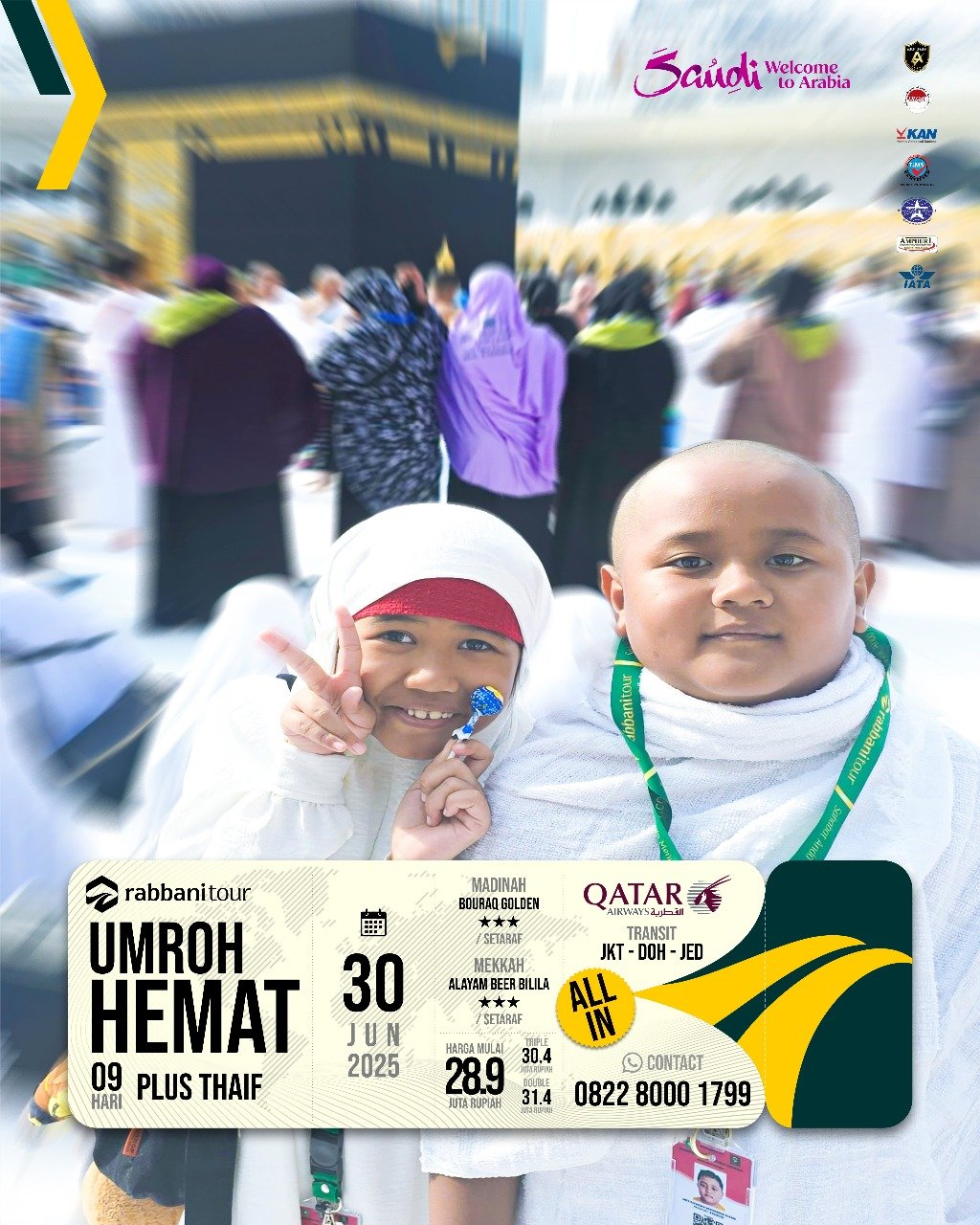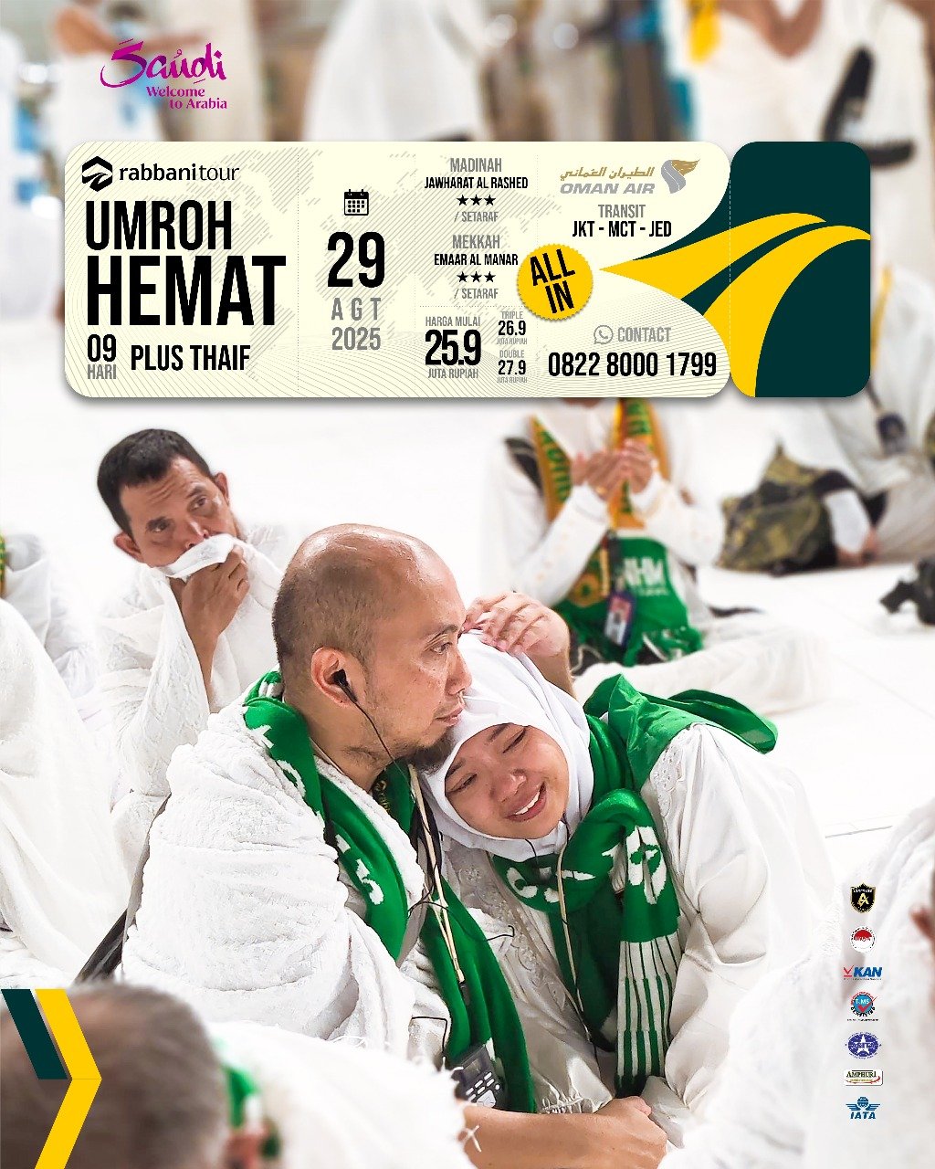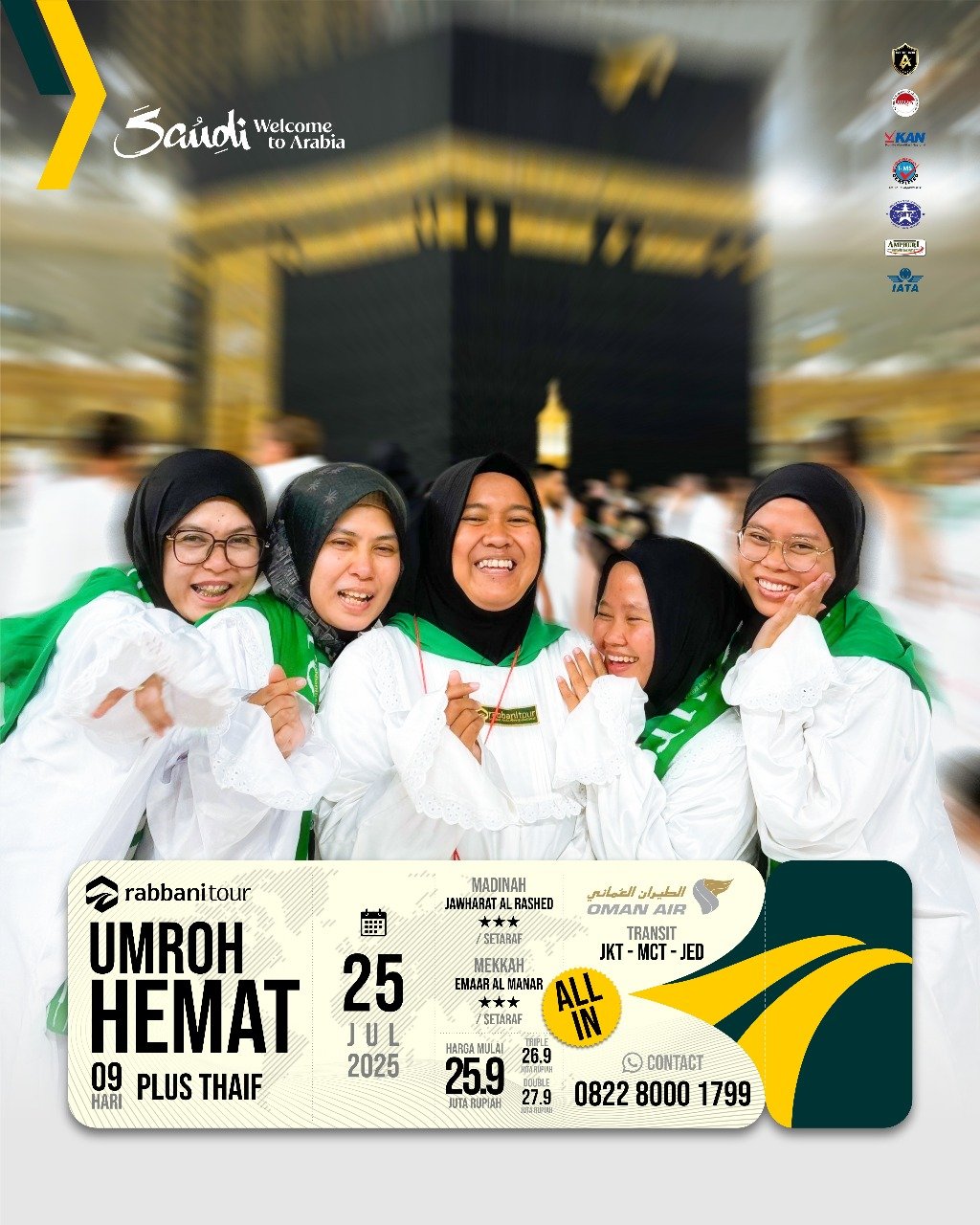 Rabbanitour menyediakan banyak pilihan tanggal keberangkatan dengan pilihan paket dan maskapai penerbangan untuk menjamin kenyamanan perjalanan umroh Anda dan keluarga.